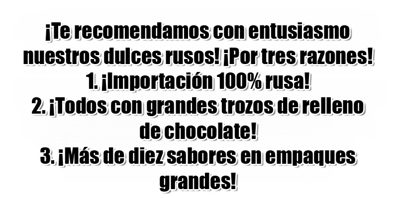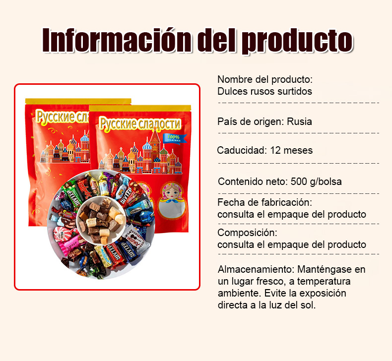 ¿Aburrido de lo mismo? Prueba lo mejor de Rusia. 🇷🇺Variedad ideal para compartir en familia o fiestas. 👨👩👧Sorprende con un regalo exótico y sofisticado. 🎁Ingredientes auténticos para un sabor tradicional. 🍫Diferentes rellenos: ¡Uno para cada antojo! 🍬Empaque icónico de Moscú, listo para regalar. 🏰Una experiencia cultural dulce sin salir de casa. ✈️Disfruta la mezcla de texturas: crujiente y suave. 🍯¡Ahorra más de $1000 comprando el pack de 3! 🔥