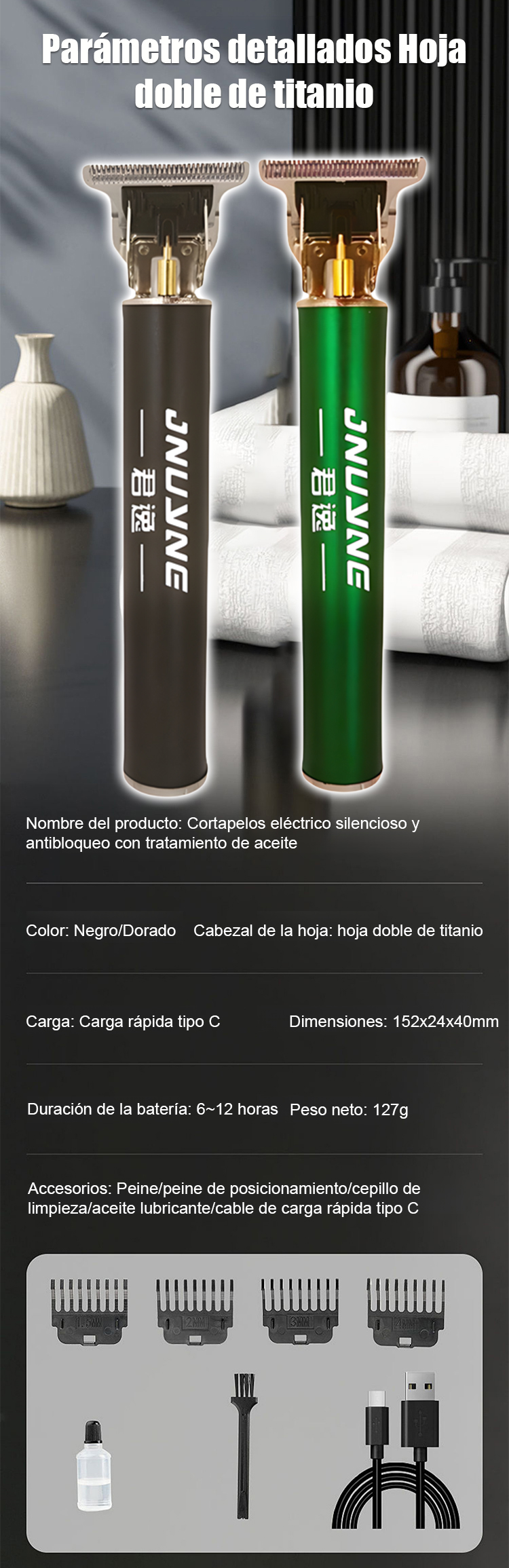 🇪🇺 Certificación de seguridad UE – motor estable, uso seguro🌿 Materiales ecológicos, sin sustancias nocivas – seguros para la piel⚙️ Cuchillas de acero sin separación – para fades, degradados y rapado total🔇 Potente y sin enganches, bajo ruido y vibración⚡ Carga rápida USB, larga duración – ideal para casa y viajes🛡️ Afiladas y duraderas, puntas redondeadas – no dañan la piel🎁 Kit completo de 8 piezas: 4 peines guía + cepillo + aceite + cable de carga